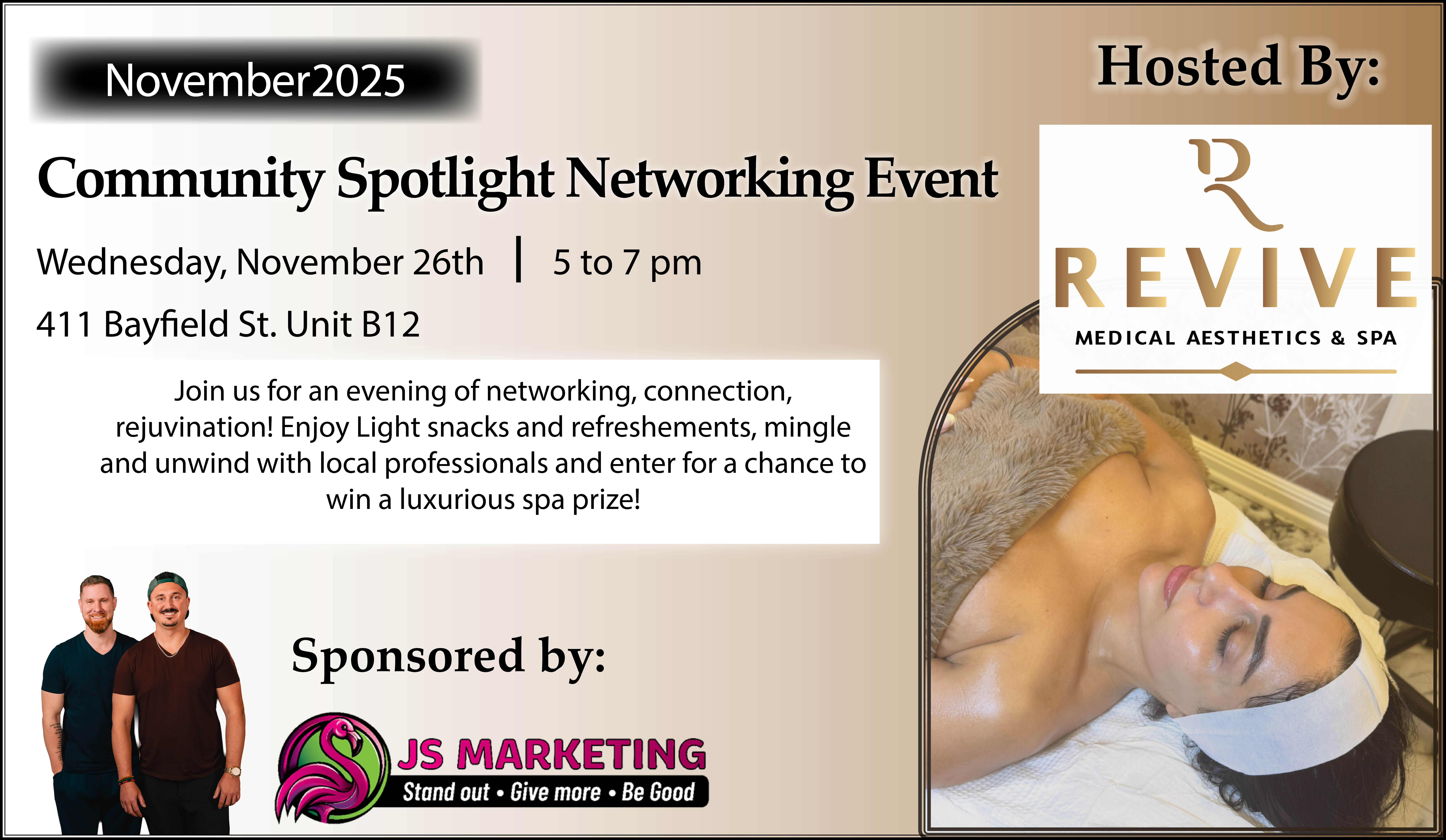 Get ready for an inspiring evening of connection, conversation, and community at this month’s Community Spotlight Networking Event, hosted at Revive Medical Spa by Dr. Marina Beshay. Revive is one of Barrie’s premier medical aesthetics and wellness destinations, led by Dr. Beshay, a physician with over 15 years of experience in advanced treatments and personalized care. Her mission is to help clients look and feel their best through a balance of science, artistry, and compassion. Join us in a beautiful and modern space where health, confidence, and business come together. You’ll have the chance to meet other driven local business owners, entrepreneurs, and community leaders who are shaping the Simcoe County market. Bring your business cards, prepare your elevator pitch, and engage in real, meaningful connection. This month, there’s no specific theme—just an evening focused on genuine relationships, collaboration, and community growth. Come ready to connect, contribute, and be part of another unforgettable night of local networking and opportunity.